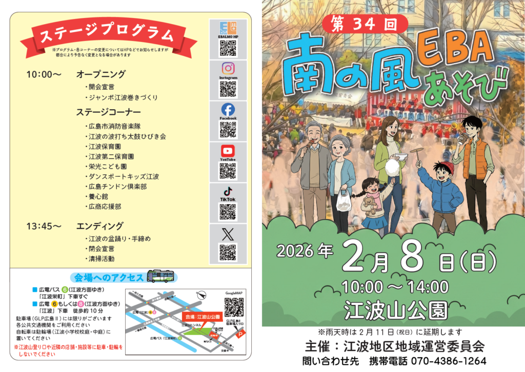 江波地区では、毎年1万人を超える参加者を集める地域最大のイベント「南の風EBAあそび」が開催されており、地域の伝統と新しい挑戦を融合させたイベントとして親しまれています。また、江波の漕伝馬は、地域の誇りとして未来に伝えるべき文化財産として大切にされています。